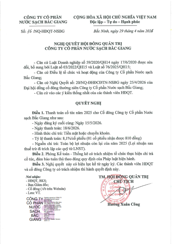 Thông báo về ngày đăng ký cuối cùng để thực hiện quyền chi trả cổ tức năm 2025 bằng tiền